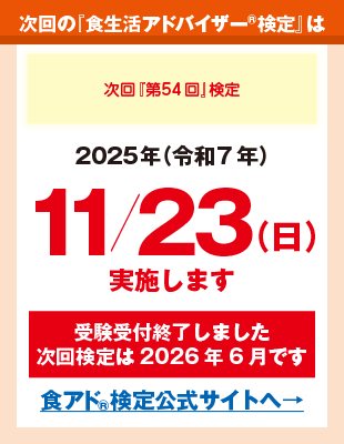 ■2025年10月27日(月):NEW! 『食と生活ジャーナル/デイリー』平日日刊更新でお届けしています■2025年10月1日(水):NEW! 『澤穂希の食アド®︎トーク』2025年秋号:更新しました■2025年9月26日(金):NEW! 『ニューステーブル10月号』更新しました■2025年6月26日(木):食生活アドバイザー®︎『1級受験に関するご案内』を更新しました。