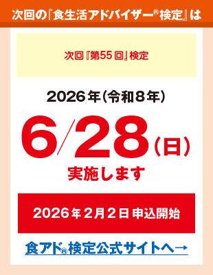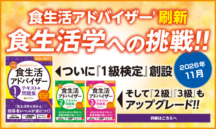 ■2025年12月11日(木):NEW! 『食と生活ジャーナル/デイリー』平日日刊更新でお届けしています■2025年11月28日(金):NEW! 『ニューステーブル12月号』更新しました■2025年11月25日(火):NEW! 食生活アドバイザー®︎『1級受験に関するご案内』を更新しました。■2025年10月1日(水):『澤穂希の食アド®︎トーク』2025年秋号:更新しました